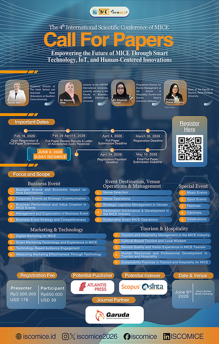 The International Scientific Conference of MICE (ISCOMICE) is an annual academic conference that brings together academics, researchers, and practitioners to discuss current issues, research, and innovations in the Meetings, Incentives, Conventions, and Exhibitions (MICE) industry. The conference is held annually and will continue to be organized in the coming years.